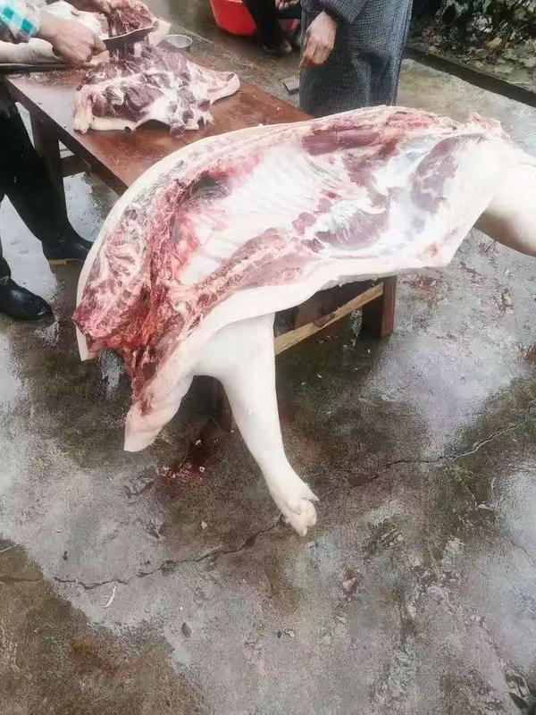 杀猪饭的筹备其实从半年前就已经开始了,家家户户都会提前备好干燥的柴禾。有经验的农户会精心挑选体型匀称,毛色光亮的土猪仔,用玉米面,红薯,青菜等混合的纯"土方"喂养,让猪在自然环境中生长出紧实的肉质,成为皮红毛亮,膘肥体壮的“年猪”后,主人家便会在冬至前后翻看黄历,选定吉日,挨家挨户邀请亲友和乡邻。这种邀请带着不容拒绝的诚意。 家乡的杀猪宴,便在这带着寒意的时刻拉开了序幕。 一缕如丝带般的炊烟由村间小院飘向天空,这便是孃孃为杀猪饭准备好的第一道工序——一大锅滚烫的开水。 大锅水烧开后,村里经常杀猪的几个壮汉们,便从猪圈里把猪赶出来,捆上手脚和猪嘴,如蚂蚁搬家一样,把猪抬到结实的木桌案板上。有人按腿,有人拽尾巴,有人揪猪耳朵。 当第一声猪嚎划破晨雾,整个村庄便立刻醒了过来,孩子们捂着耳朵又忍不住凑近看热闹。叔叔准备好放肉的稻草和油布,孃孃早准备好了接猪血用的盆,里面放上些盐水,然后拿上些土纸和青香,在猪头前点燃青,用碗敬一敬,然后往地上泼上些白酒,口中念念有词,都是些来年保平安、健康、吉祥、风调雨顺等的美好愿望,这便是家乡杀猪前举行的传统而简单的祈福仪式。